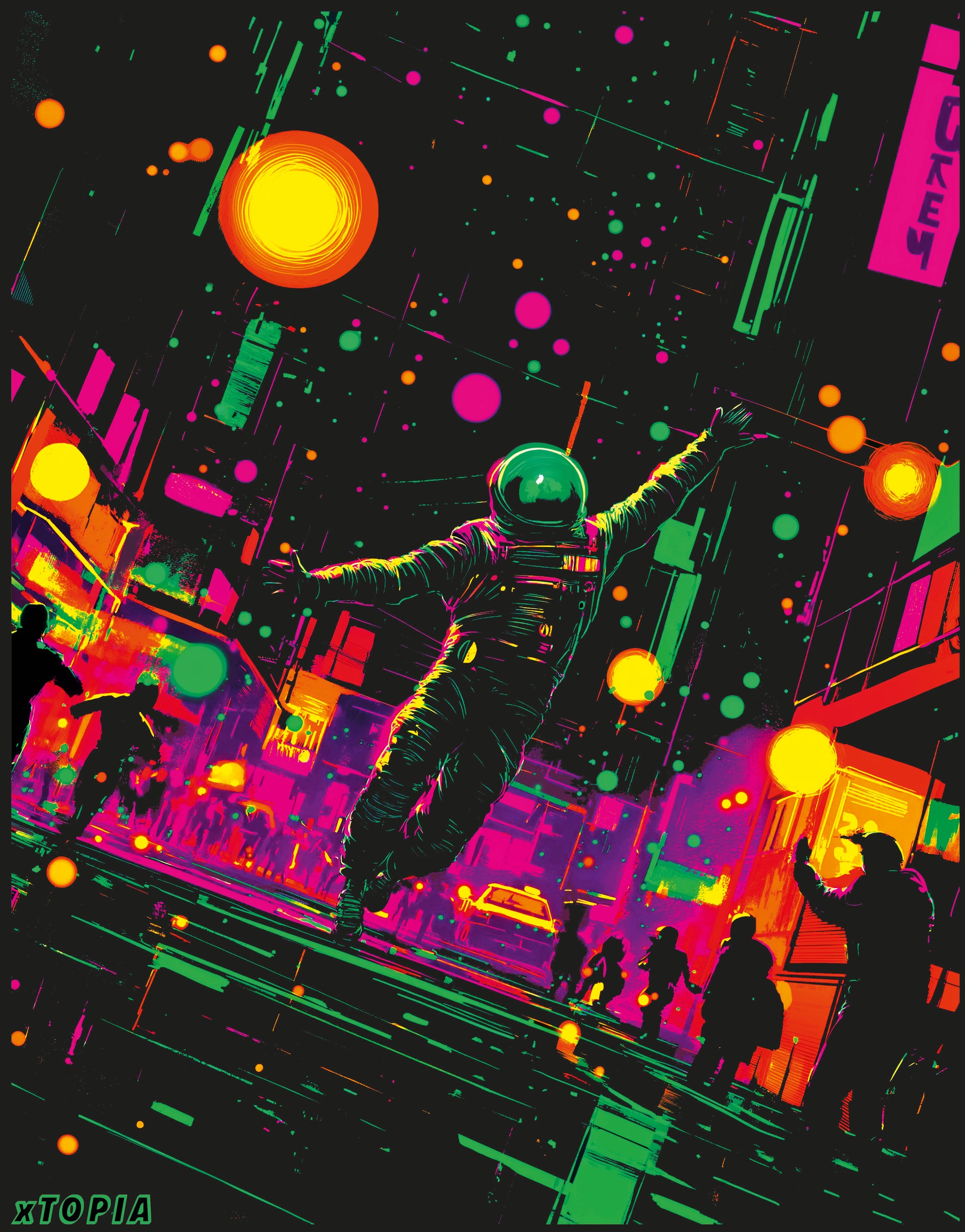 Dystopian scenes rarely look to be much fun, so this T-shirt takes a twist... just like the mid-air dancer in the spacesuit.